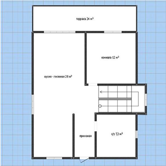 - Кухня-гостиная 38 м², спальня 12 м² и санузел 4 м² на первом этаже