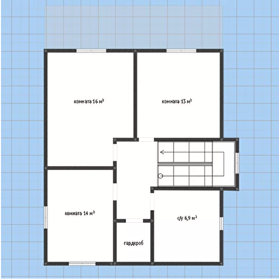 - Три спальни, 16 м², 13 м², 14 м², гардеробная 4 м², санузел 4 м² на втором этаже