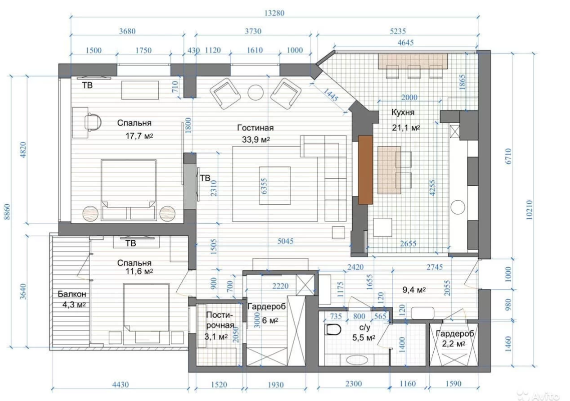 Квартира общей площадью 120 кв. м с отдельной зоной для спальни,