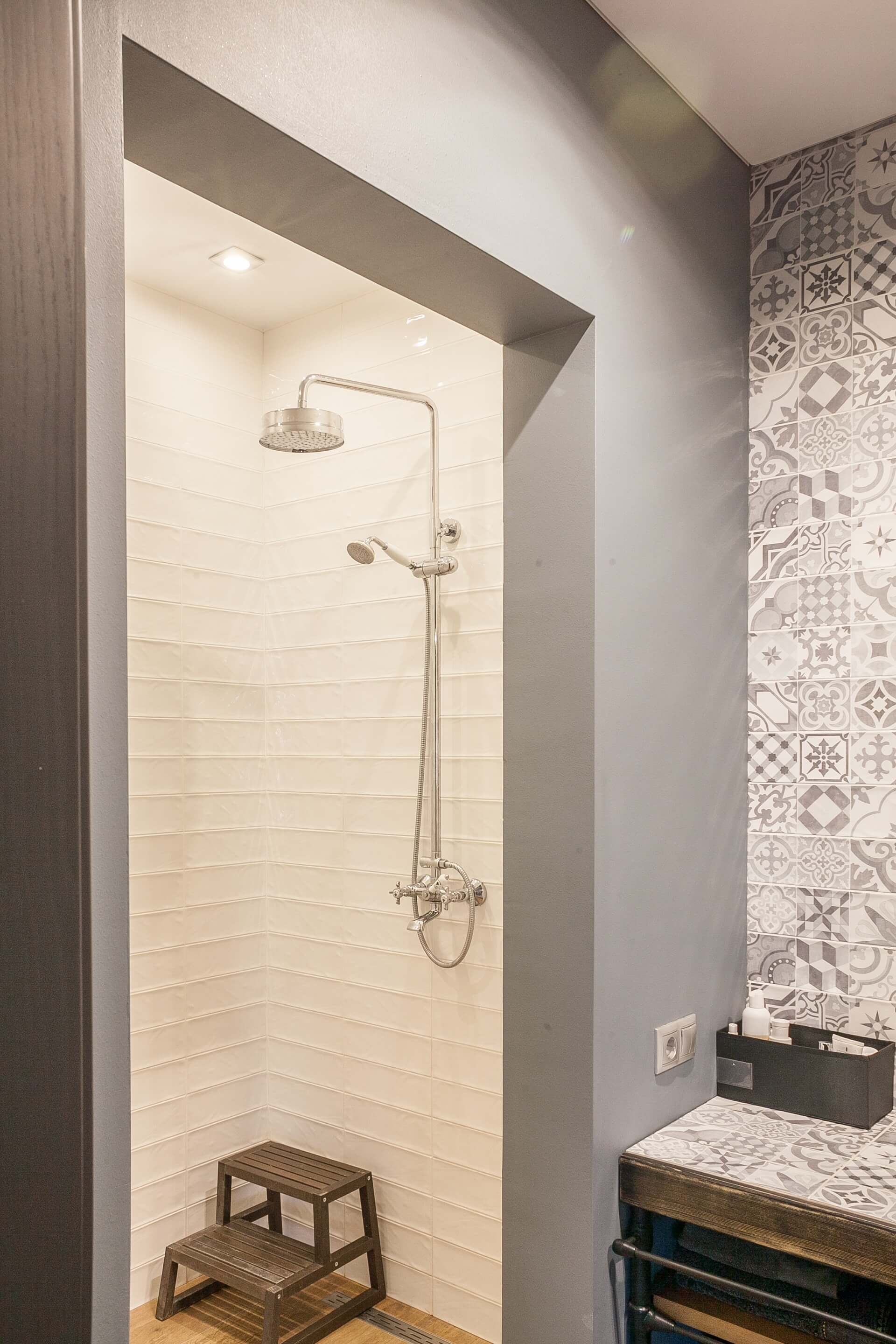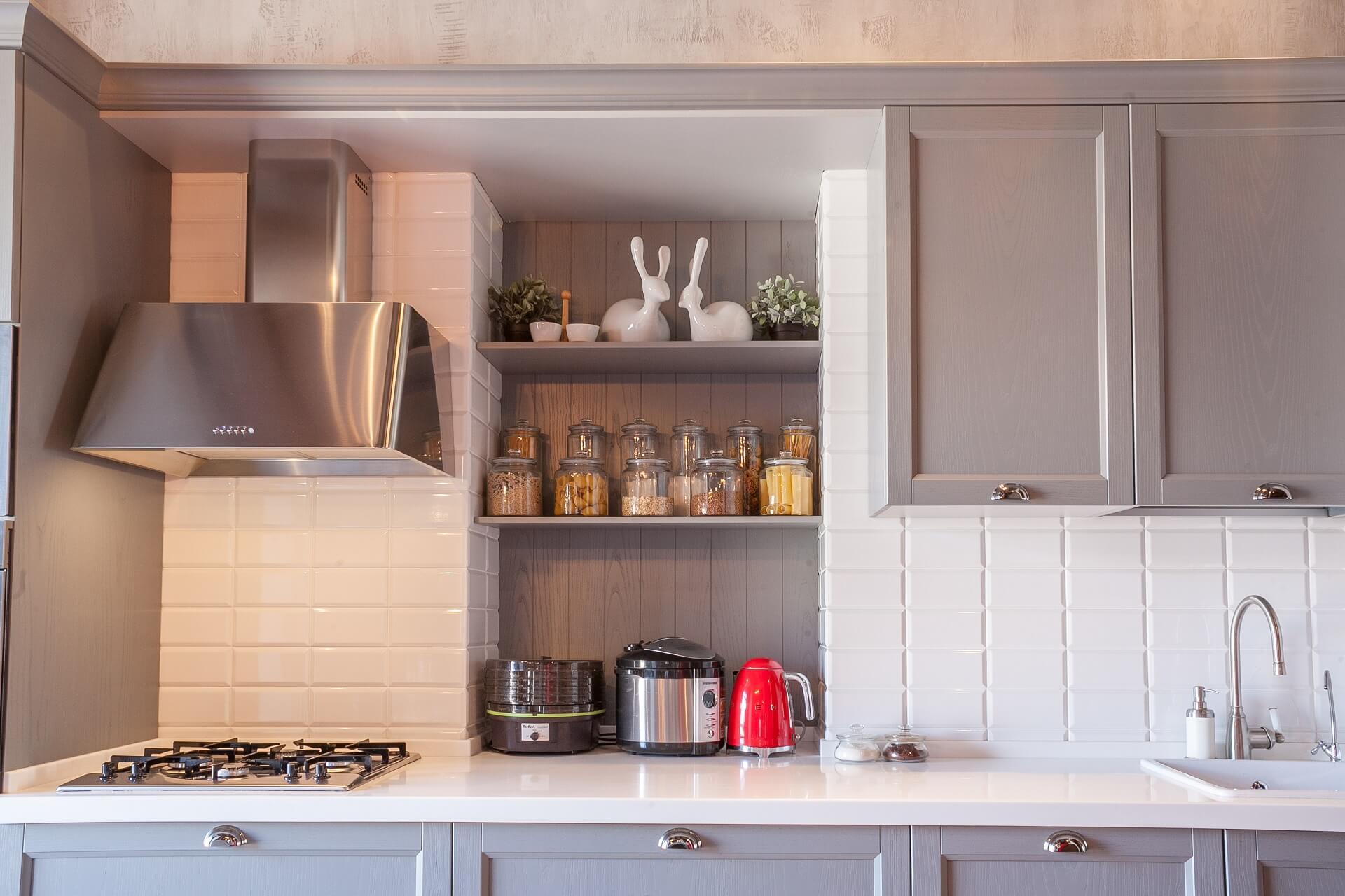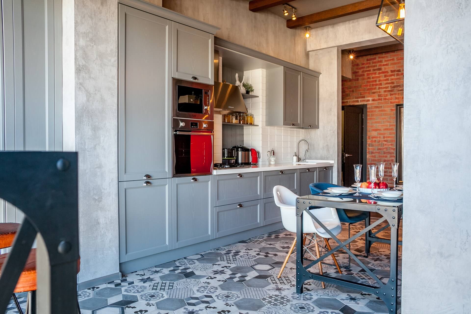 Кухня — одна из самых светлых комнат. Этому способствуют открытые панорамные окна с видом на море. Пол и столешница барной стойки выполнены из керамической плитки в стиле пэчворк.