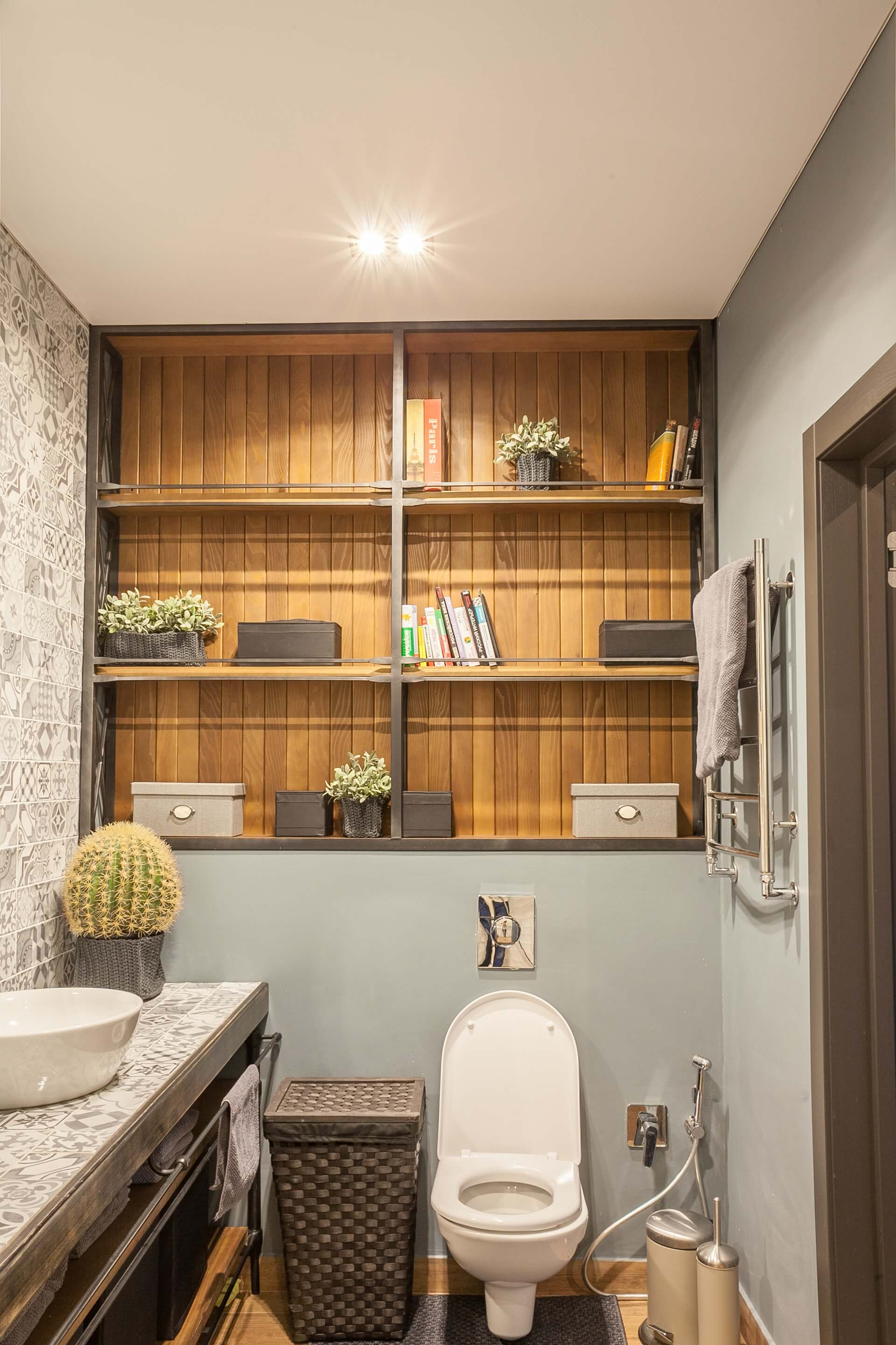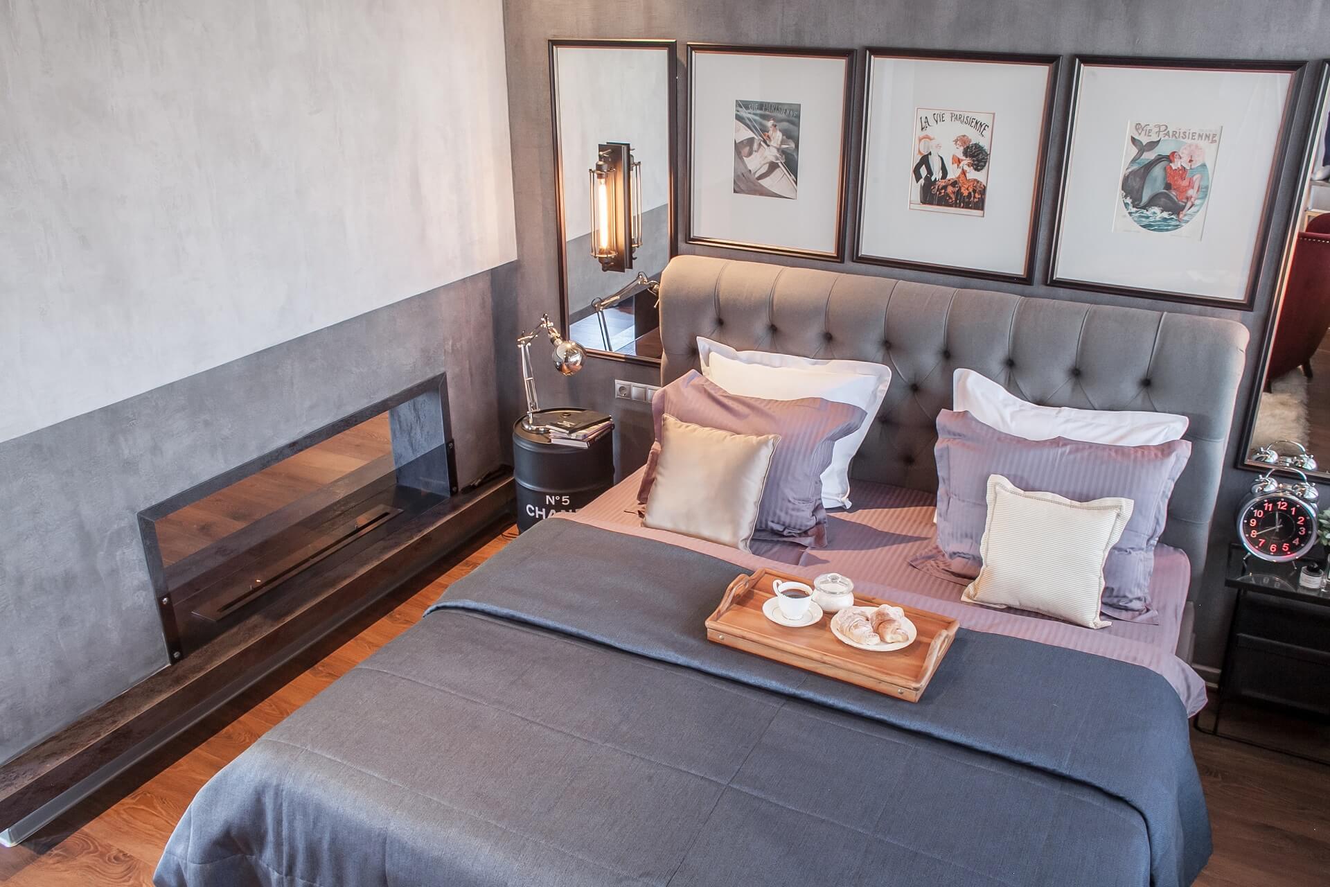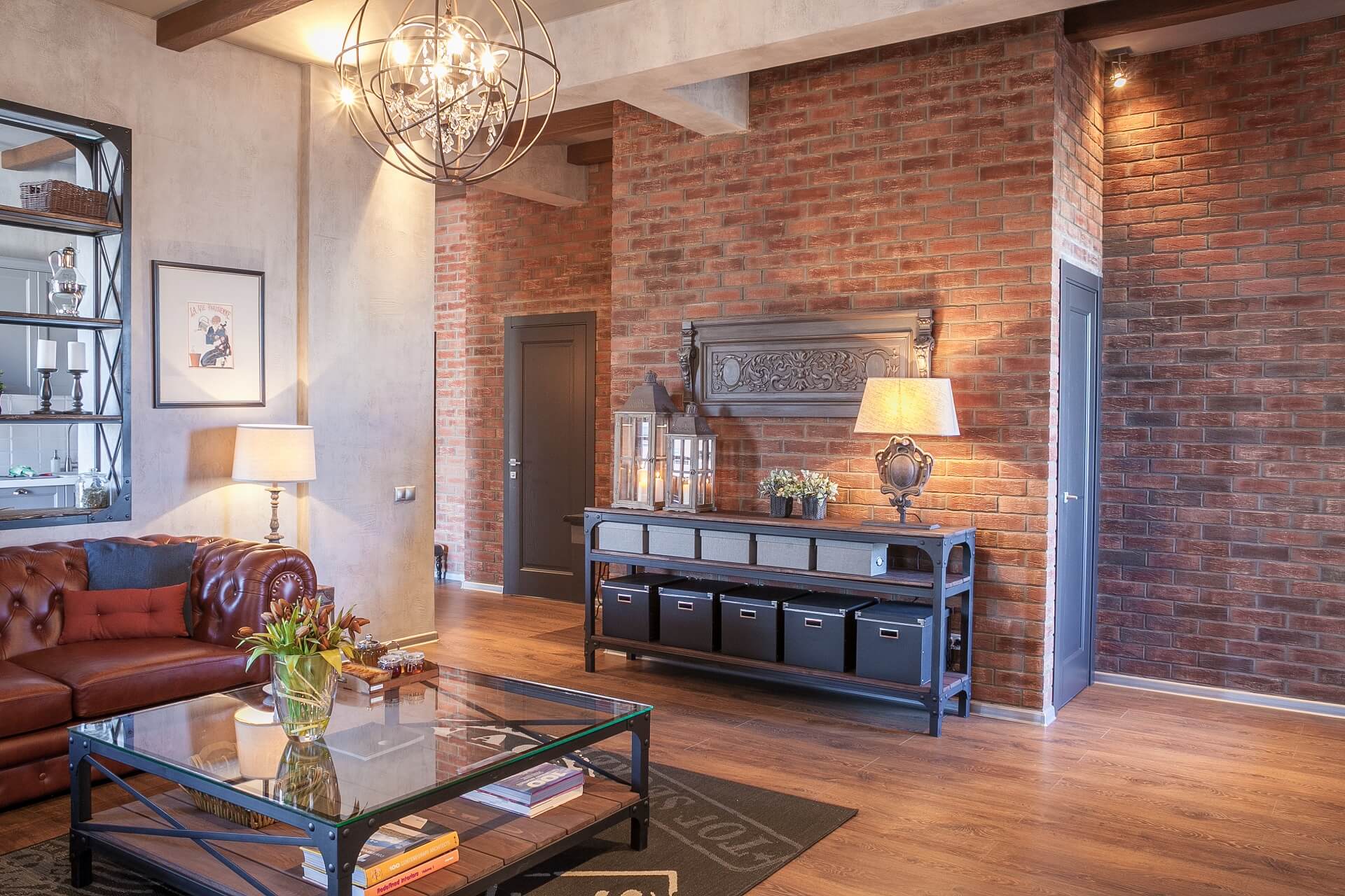 Мебель в гостиной выполнена по индивидуальному заказу. В отделке использованы материалы, характерные для стиля лофт: клинкерный кирпич, состаренный вручную, грубая штукатурка под бетон, дерево. Особую атмосферу создаёт двусторонний биокамин из гостиной в спальню.