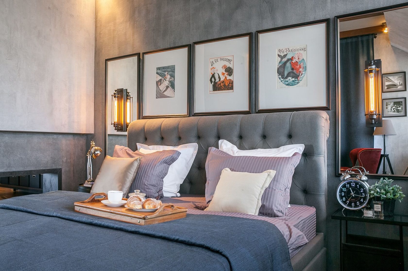 Интерьер квартиры наполнен декором: кожаные сундуки и карта мира на ковре, гравюры 19 века привезенные из Парижа.